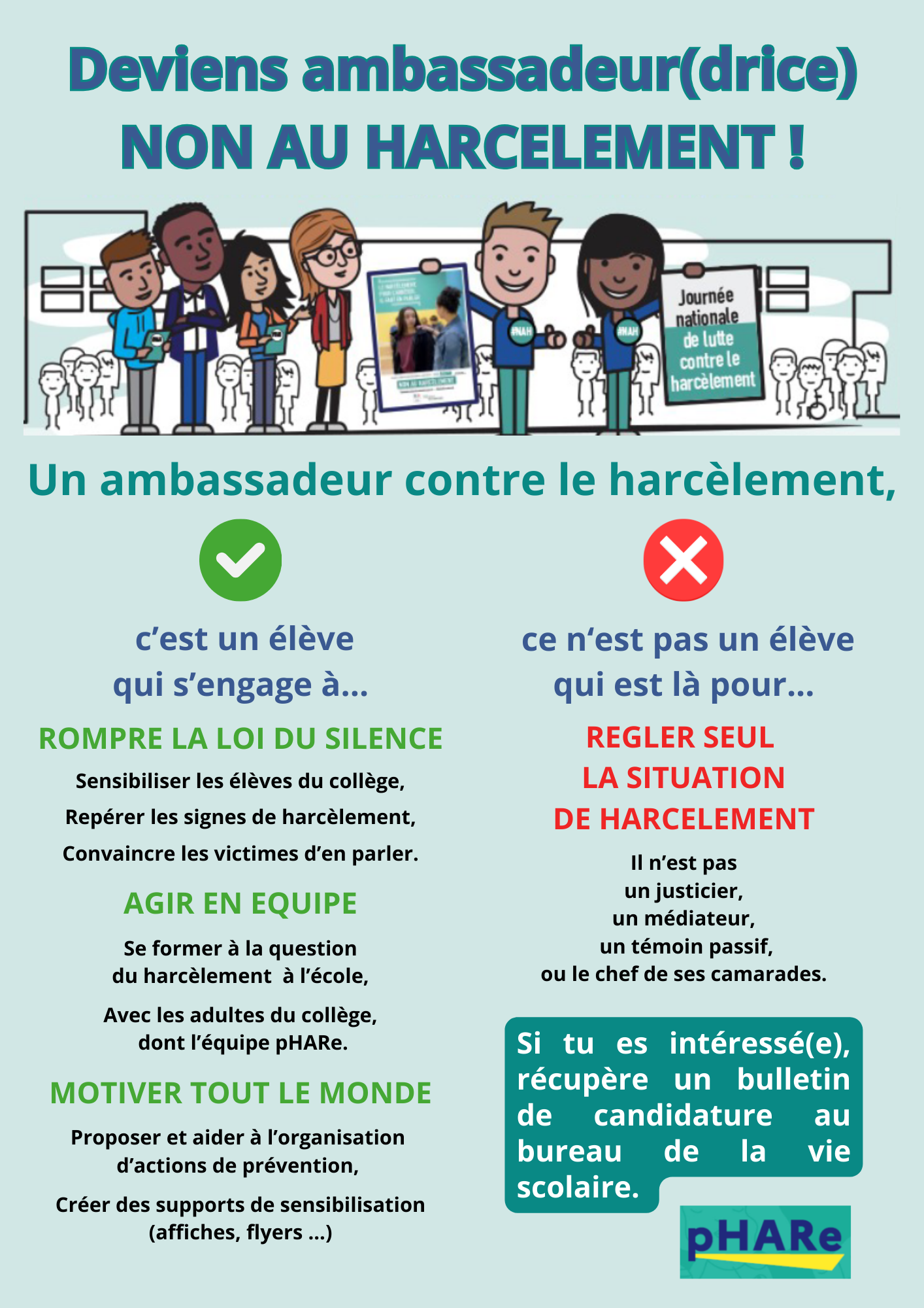Comme chaque année, le collège a participé à la journée nationale d’éducation à la prévention du harcèlement à l’Ecole qui s’est déroulée le jeudi 6 novembre.